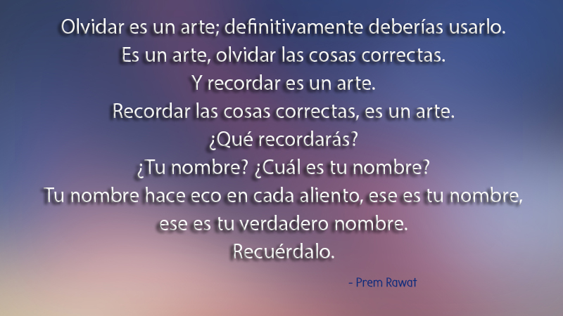 Olvidar es un arte; definitivamente deberías usarlo. Es un arte, olvidar las cosas correctas. Y recordar es un arte. Recordar las cosas correctas, es un arte. ¿Qué recordarás? ¿Tu nombre? ¿Cuál es tu nombre? Tu nombre hace eco en cada aliento, ese es tu nombre, ese es tu verdadero nombre. Recuérdalo.