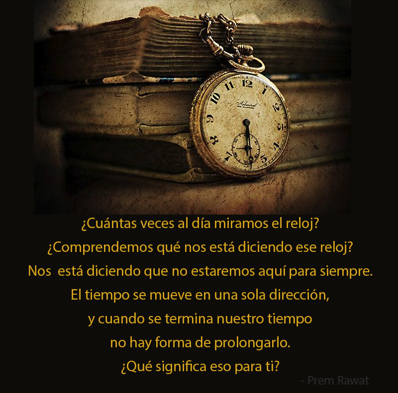 ¿Cuántas veces al día miramos el reloj? ¿Comprendemos qué nos está diciendo ese reloj? Nos está diciendo que no estaremos aquí para siempre. El tiempo se mueve en una sola dirección, y cuando se termina nuestro tiempo no hay forma de prolongarlo. ¿Qué significa eso para ti?