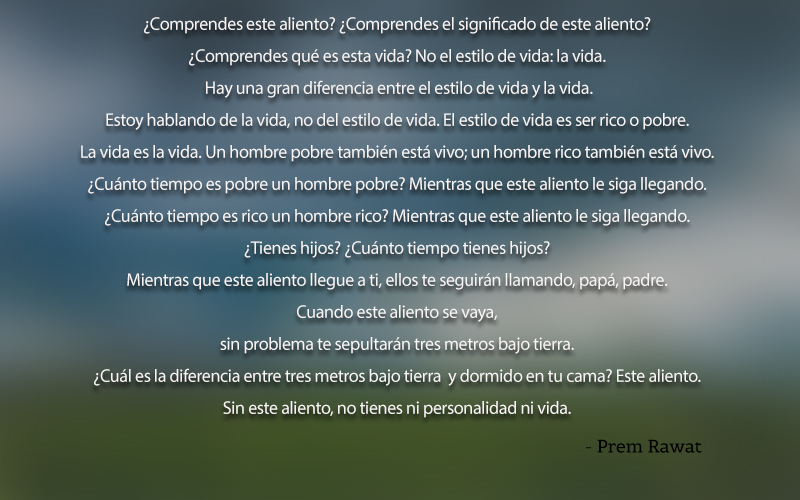 ¿Comprendes este aliento? ¿Comprendes el significado de este aliento? ¿Comprendes qué es esta vida? No el estilo de vida: la vida. Hay una gran diferencia entre el estilo de vida y la vida. Estoy hablando de la vida, no del estilo de vida. El estilo de vida es ser rico o pobre. La vida es la vida. Un hombre pobre también está vivo; un hombre rico también está vivo. ¿Cuánto tiempo es pobre un hombre pobre? Mientras que este aliento le siga llegando. ¿Cuánto tiempo es rico un hombre rico? Mientras que este aliento le siga llegando. ¿Tienes hijos? ¿Cuánto tiempo tienes hijos? Mientras que este aliento llegue a ti, ellos te seguirán llamando, papá, padre. Cuando este aliento se vaya, sin problema te sepultarán tres metros bajo tierra. ¿Cuál es la diferencia entre tres metros bajo tierra y dormido en tu cama? Este aliento. Sin este aliento, no tienes ni personalidad ni vida.