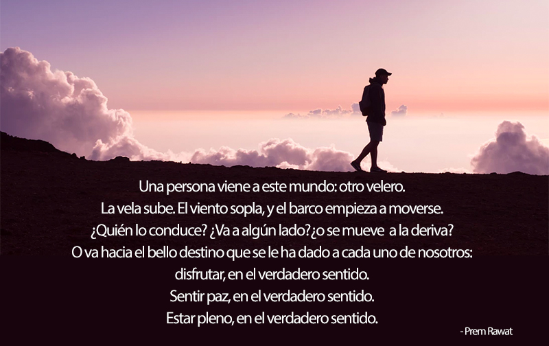 Una persona viene a este mundo: otro velero. La vela sube. El viento sopla, y el barco empieza a moverse. ¿Quién lo conduce? ¿Va a algún lado? O, ¿o se mueve a la deriva? O va hacia el bello destino que se le ha dado a cada uno de nosotros: disfrutar, en el verdadero sentido. Sentir paz, en el verdadero sentido. Estar pleno, en el verdadero sentido.