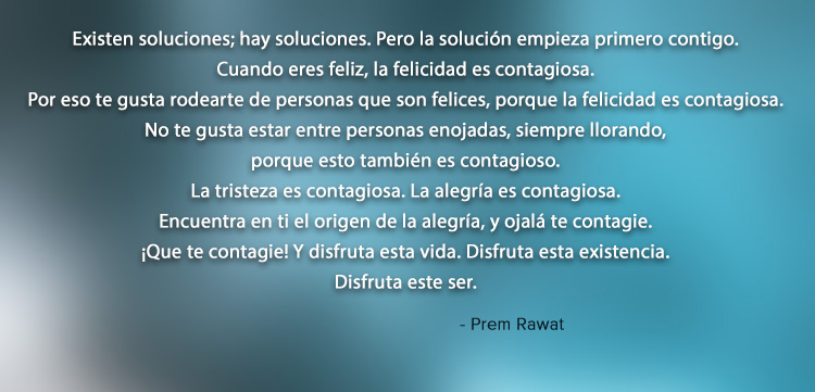 Existen soluciones; hay soluciones. Pero la solución empieza primero contigo. Cuando eres feliz, la felicidad es contagiosa. Por eso te gusta rodearte de personas que son felices, porque la felicidad es contagiosa. No te gusta estar entre personas enojadas, siempre llorando, porque esto también es contagioso. La tristeza es contagiosa. La alegría es contagiosa. Encuentra en ti el origen de la alegría, y ojalá te contagie. ¡Te contagie! Y, disfruta esta vida. Disfruta esta existencia. Disfruta este ser.