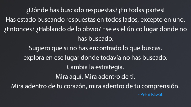¿Dónde has buscado respuestas? ¡En todas partes! Has estado buscando respuestas en todos lados, excepto en uno. ¿Entonces? ¿Hablamos de lo obvio? Ese es el único lugar donde no has buscado. Sugiero que si no has encontrado lo que buscas, explora en ese lugar donde todavía no has buscado. Cambia la estrategia. Mira aquí. Mira adentro de ti. Mira adentro de tu corazón, mira adentro de tu comprensión.