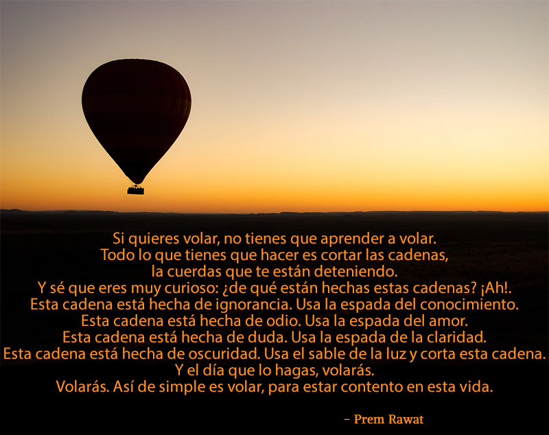 Si quieres volar, no tienes que aprender a volar. Todo lo que tienes que hacer es cortar las cadenas, la cuerda que te está deteniendo. Y sé que eres muy curioso, ¿de qué están hechas estas cadenas? !Ah¡ Esta cadena está hecha de ignorancia. Usa la espada del conocimiento. Esta cadena está hecha de odio. Usa la espada del amor. Esta cadena está hecha de duda. Usa la espada de la claridad. Esta cadena está hecha de oscuridad. Usa el saber de la luz y corta esta cadena. Y el día que lo hagas, volarás. Volarás. Así de simple es volar, para estar contento en esta vida.