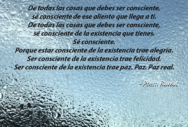 De todas las cosas que debes ser consciente, sé consciente de ese aliento que llega a ti. De todas las cosas que debes ser consciente, sé consciente de la existencia que tienes. Sé consciente. Porque estar consciente de la existencia trae alegría. Ser consciente de la existencia trae felicidad. Ser consciente de la existencia trae paz. Paz. Paz real.