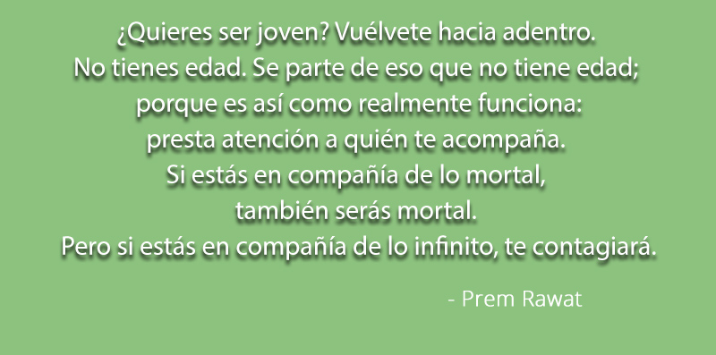 ¿Quieres ser joven? Vuélvete hacia adentro. No tienes edad. Se parte de eso que no tiene edad; porque es así como realmente funciona: presta atención a quién te acompaña. Si estás en compañía de lo mortal, también serás mortal. Pero si estás en compañía de lo infinito, te contagiará.