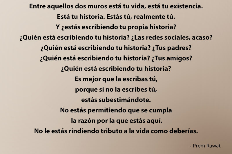 Entre aquellos dos muros está tu vida, está tu existencia. Está tu historia. Estás tú, realmente tú. Y ¿estás escribiendo tu propia historia? ¿Quién está escribiendo tu historia? ¿Las redes sociales, acaso? ¿Quién está escribiendo tu historia? ¿Tus padres? ¿Quién está escribiendo tu historia? ¿Tus amigos? ¿Quién está escribiendo tu historia? Es mejor que la escribas tú, porque si no la escribes tú, estás subestimándote. No estás permitiendo que se cumpla la razón por la que estás aquí. No estás le estás rindiendo tributo a la vida como deberías.