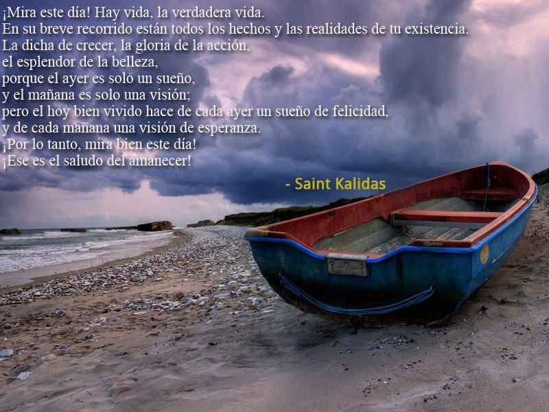 ¡Mira este día! Hay vida, la verdadera vida. En su breve recorrido están todas las variantes y las realidades de tu existencia. La dicha del crecimiento, la gloria de la acción, el esplendor de la belleza, porque ayer es solo un sueño, y mañana es solo una visión; pero el bien vivido hace de cada ayer un sueño de felicidad, y de cada mañana una visión de esperanza. ¡Por lo tanto, mira bien este día! ¡Ese en el saludo del amanecer desde siempre!