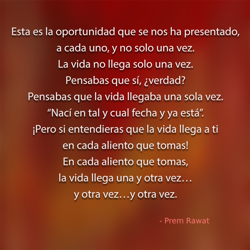 Esta es la oportunidad que se nos ha presentado, a cada uno, y no solo una vez. La vida no llega solo una vez. Pensabas que sí, ¿verdad? Pensabas que la vida llegaba una sola vez. “Nací en tal y cual fecha y ya está”. ¡Pero si entendieras que la vida llega a ti en cada aliento que tomas! En cada aliento que tomas, la vida llega una y otra vez… y otra vez… y otra vez.