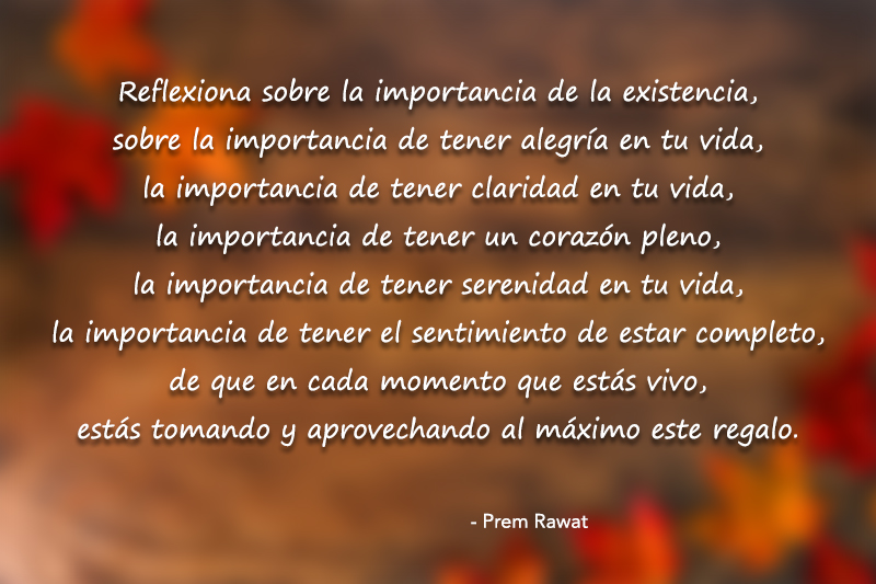 Reflexiona sobre la importancia de la existencia sobre la importancia de tener alegría en tu vida, la importancia de tener claridad en tu vida, la importancia de tener un corazón pleno, la importancia de tener serenidad en tu vida, la importancia de tener el sentimiento de estar completo, de que en cada momento que estás vivo, estás tomando y aprovechando al máximo este regalo.
