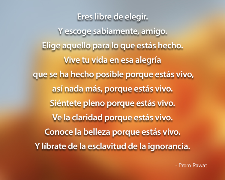 Eres libre de elegir. Y escoge sabiamente, amigo. Elige aquello para lo que estás hecho. Vive tu vida en esa alegría que se hecho posible porque estás vivo, así nada más, porque estás vivo. Siéntete pleno porque estás vivo. Ve la claridad porque estás vivo. Conoce la belleza porque estás vivo. Y líbrate de la esclavitud de la ignorancia.