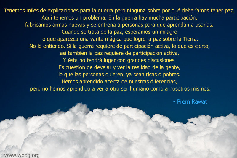 Tenemos miles de explicaciones para la guerra pero ninguna sobre por qué deberíamos tener paz. Aquí tenemos un problema. En la guerra hay mucha participación. fabricamos armas nuevas y se entrena a personas para que aprendan a usarlas. Cuando se trata de la paz esperamos un milagro o que aparezca una varita mágica que logre la paz sobre la Tierra. No lo entiendo. Si la guerra requiere de participación activa, lo que es cierto, así también la paz requiere de participación activa. Y ésta no tendrá lugar con grandes discusiones. Es cuestión de develar y ver la realidad de la gente, lo que las personas quieren, ya sean ricas o pobres. Hemos aprendido acerca de nuestras diferencias, pero no hemos aprendido a ver a otro ser humano como a nosotros mismos.