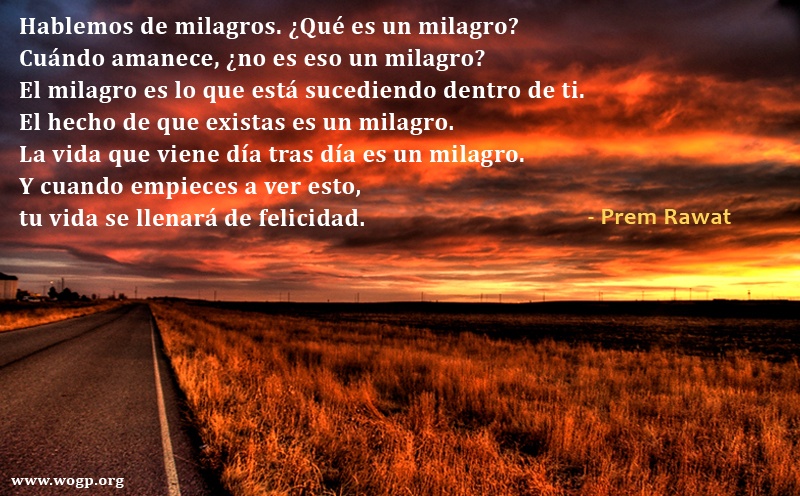 Hablemos de milagros. ¿Qué es un milagro? Cuándo amanece ¿no es eso un milagro? El milagro es lo que está sucediendo dentro de ti. El hecho de que existas es un milagro. La vida que viene día tras día es un milagro. Y cuando empieces a ver esto, tu vida se llenará de felicidad.