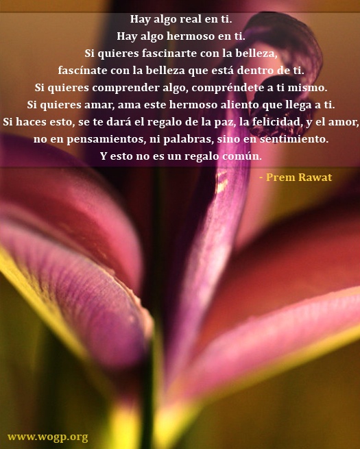 Hay algo real en ti. Hay algo hermoso en ti. Si quieres fascinarte con la belleza, fascínate con la belleza que está dentro de ti. Si quieres comprender algo, compréndete a ti mismo. Si quieres amar, ama este hermoso aliento que llega a ti. Si haces esto, se te dará el regalo de la paz, la felicidad, y el amor, no en pensamientos, ni palabras, sino en sentimiento. Y esto no es un regalo común.