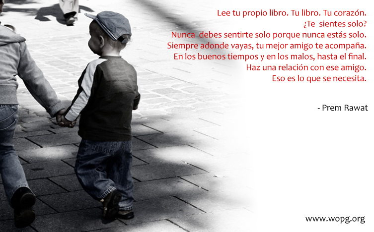 Lee tu propio libro. Tu libro. Tu corazón. ¿Te sientes solo? Nunca debes de sentir solo porque nunca estás solo. Siempre, adonde vayas, tu mejor amigo te acompaña. En buenos tiempos y en los malos, hasta el mero final. Haz una relación con ese amigo. Eso es lo que se necesita.