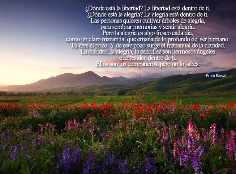 ¿Dónde está la libertad? La libertad está dentro de ti. ¿Dónde está la alegría? La alegría está dentro de ti. Las personas quieren cultivar árboles de alegría, para sembrar memorias y sentir alegría. Pero la alegría es algo fresco cada día, como un claro manantial que emana de lo profundo del ser humano. Tú eres el pozo. Y de este pozo surge el manantial de la claridad. La claridad, la alegría, la sencillez son hermosos ángeles que residen dentro de ti. Ellos son tus compañeros, pero no lo sabes.