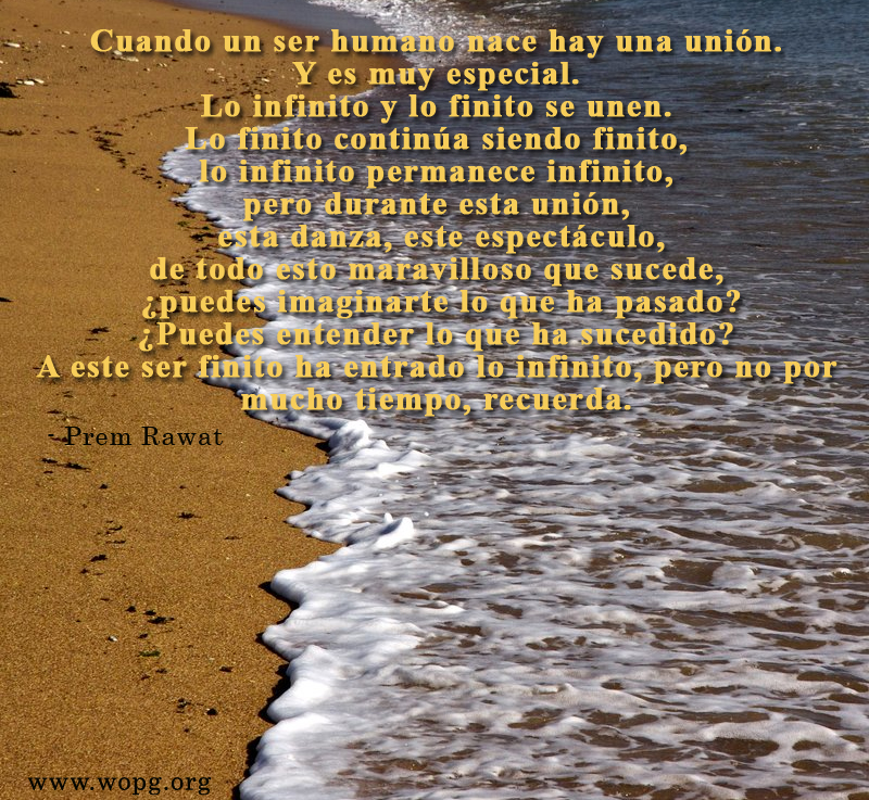 Cuando un ser humano nace hay una unión. Y es muy especial. Lo infinito y lo finito se unen. Lo finito continúa siendo finito, lo infinito permanece infinito, pero durante esta unión, esta danza, este espectáculo, de todo esto maravilloso que sucede, ¿puedes imaginarte lo que ha pasado? ¿Puedes entender lo que ha sucedido? A este ser finito ha entrado lo infinito, no por mucho tiempo, recuerda.