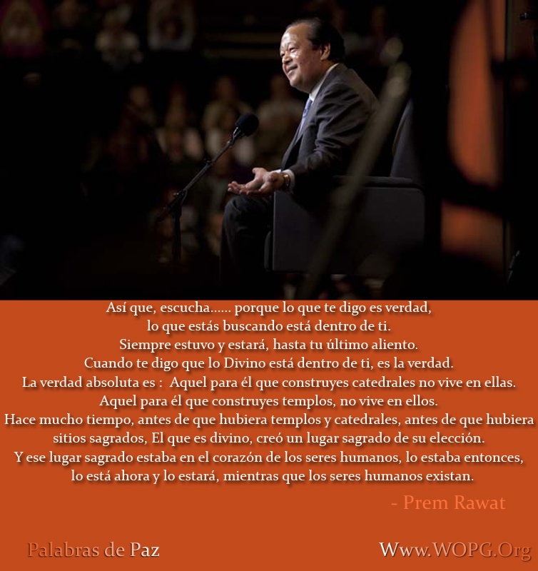 Así que, escucha…… porque lo que te digo es verdad, lo que estás buscando está dentro de ti. Siempre estuvo y estará, hasta tu último aliento. Cuando te digo que lo Divino está dentro de ti, es la verdad. La verdad absoluta es : Aquel para quien construyes catedrales no vive en ellas. Aquel para quien construyes templos, no vive en ellos. Hace mucho tiempo, antes de que hubiera templos y catedrales, antes de que hubiera sitios sagrados, Aquel que es divino creó un lugar sagrado de su elección. Y ese lugar sagrado estaba en el corazón de los seres humanos, lo estaba entonces, lo está ahora y lo estará mientras que los seres humanos existan.