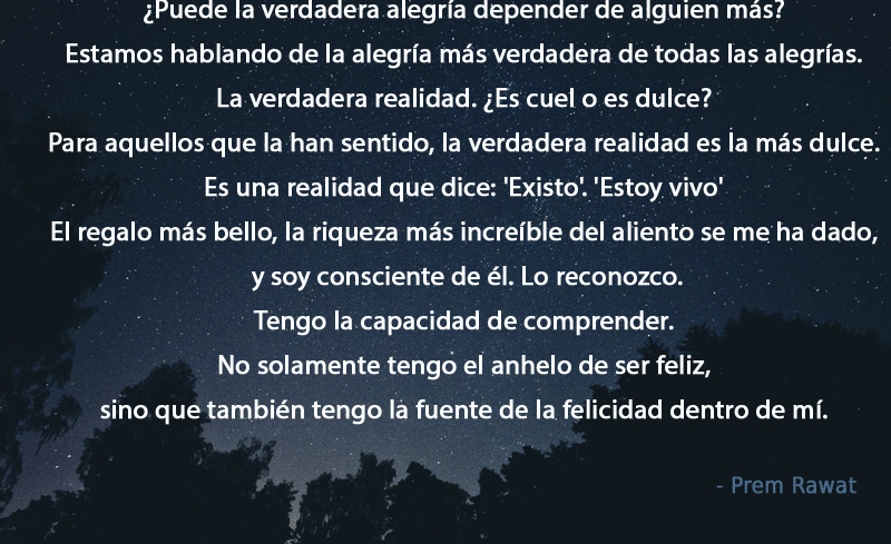 ¿Puede la verdadera alegría depender de alguien más? Estamos hablando de la alegría más verdadera de todas las alegrías. La verdadera realidad. ¿Es cuel o es dulce? Para aquellos que la han sentido, la verdadera realidad es la más dulce. Es una realidad que dice: 'Existo'. 'Estoy vivo' El regalo más bello, la riqueza más increíble del aliento se me ha dado, y soy consciente de él. Lo reconozco. Tengo la capacidad de comprender. No solamente tengo el anhelo de ser feliz, sino que también tengo la fuente de la felicidad dentro de mí.