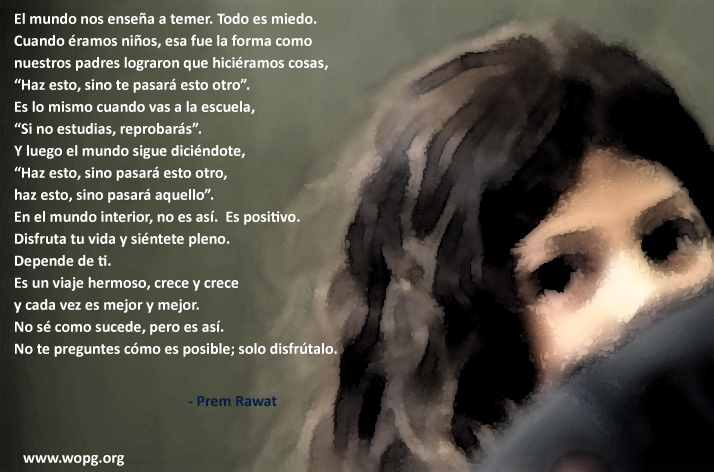 El mundo nos enseña a temer. Todo es miedo. Cuando éramos niños, esa fue la forma como nuestros padres lograron que hiciéramos cosas, “Haz esto, sino te pasará esto otro”. Es lo mismo cuando vas a la escuela, “Si no estudias, reprobarás”. Y luego el mundo sigue diciéndote, “Haz esto, sino pasará esto otro, haz esto, sino pasará aquello”. En el mundo interior, no es así. Es positivo. Disfruta tu vida y siéntete pleno. Depende de ti. Es un viaje hermoso, crece y crece y cada vez es mejor y mejor. No sé como sucede, pero es así. No te preguntes cómo es posible; solo disfrútalo.