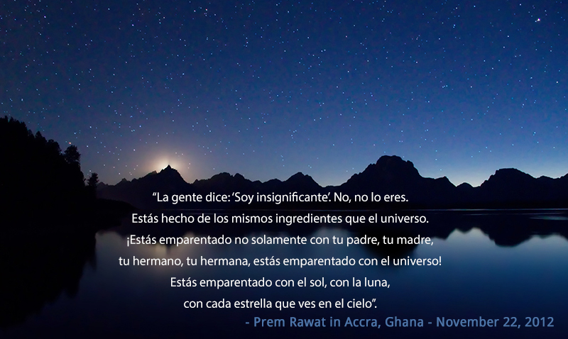 “La gente dice: ‘Soy insignificante’. No, no lo eres. Estás hecho de los mismos ingredientes que el universo. ¡Estás emparentado no solamente con tu padre, tu madre, tu hermano, tu hermana, ¡estás emparentado con el universo! Estás emparentado con el sol, con la luna, con cada estrella que ves en el cielo”. Prem Rawat en Accra, Ghana- 22 de noviembre, 2012