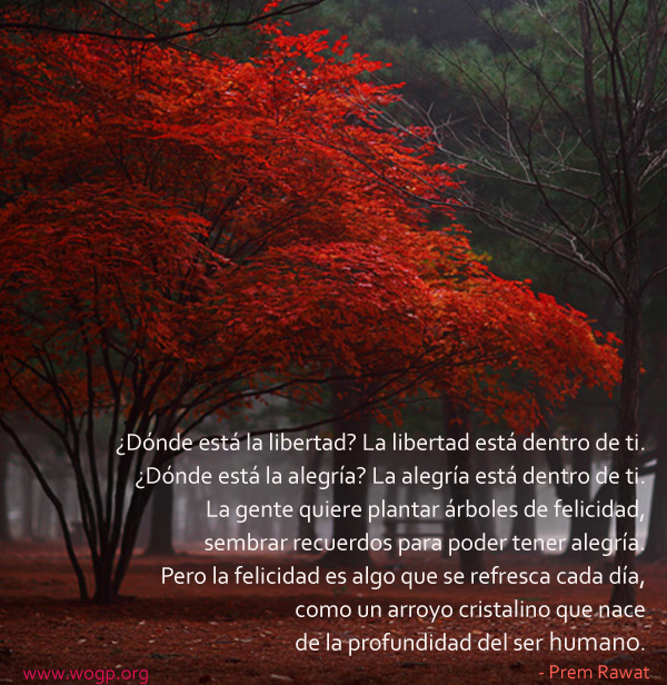 ¿Dónde está la libertad? La libertad está dentro de ti. ¿Dónde está la alegría? La alegría está dentro de ti. La gente quiere plantar árboles de felicidad, sembrar recuerdos para poder tener alegría. Pero la felicidad es algo que se refresca cada día, como un arroyo cristalino que nace de la profundidad del ser humano.
