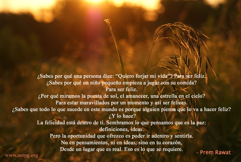 ¿Sabes por qué una persona dice: “Quiero forjar mi vida”? Para ser feliz. ¿Sabes por qué un niño pequeño empieza a jugar con su comida? Para ser feliz. ¿Por qué miramos la puesta de sol, el amanecer, una estrella en el cielo? Para estar maravillados por un momento y así ser felices. ¿Sabes que todo lo que sucede en este mundo es porque alguien piensa que lo va a hacer feliz? ¿Y lo hace? La felicidad está dentro de ti. Sembramos lo que pensamos que es la paz: definiciones, ideas. Pero la oportunidad que ofrezco es poder ir adentro y sentirla. No en pensamientos, ni en ideas, sino en tu corazón, Desde un lugar que es real. Eso es lo que se requiere.