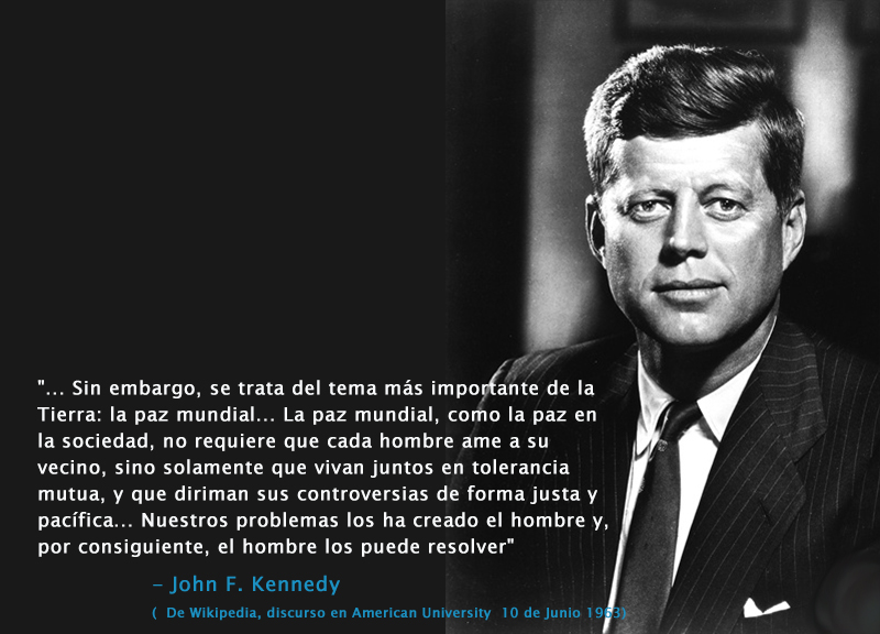 "… pero es el tema más importante sobre la tierra: la paz mundial. La paz mundial, como la paz en las comunidades, no requiere que cada hombre ame a su vecino. Solo requiere que vivan juntos en tolerancia mutua. Nuestros problemas son creados por las personas, así que pueden ser resueltos por las personas."