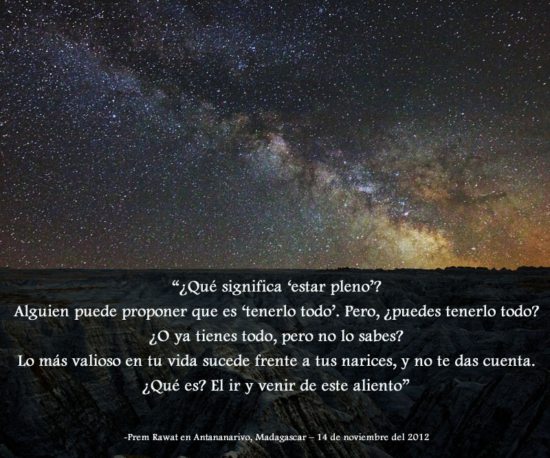 ¿Qué significa ‘estar pleno’? Alguien puede proponer que es ‘tenerlo todo’. Pero, ¿puedes tenerlo todo? ¿O ya tienes todo, pero no lo sabes? Lo más valioso en tu vida sucede frente a tus narices, y no te das cuenta. ¿Qué es? El ir y venir de este aliento.