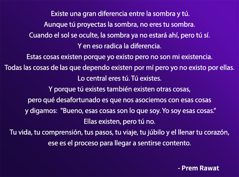 Existe una gran diferencia entre la sombra y tú. Aunque tú proyectas la sombra, no eres tu sombra. Cuando el sol se oculte, la sombra ya no estará ahí, pero tú sí. Y en eso radica la diferencia. Estas cosas existen porque yo existo pero no son mi existencia. Todas las cosas de las que dependo existen por mí pero yo no existo por ellas. Lo central eres tú. Tú existes. Y porque tú existes también existen otras cosas, pero qué desafortunado es que nos asociemos con esas cosas y digamos: "Bueno, esas cosas son lo que soy. Yo soy esas cosas.” Ellas existen, pero tú no. Tu vida, tu comprensión, tus pasos, tu viaje, tu júbilo y el llenar tu corazón, ese es el proceso para llegar a sentirse contento.