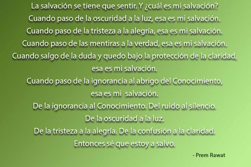 La salvación se tiene que sentir. Y ¿cuál es mi salvación? Cuando paso de la oscuridad a la luz, esa es mi salvación. Cuando paso de la tristeza a la alegría, esa es mi salvación. Cuando paso de las mentiras a la verdad, esa es mi salvación. Cuando salgo de la duda y quedo bajo la protección de la claridad, esa es mi salvación. Cuando paso de la ignorancia al abrigo del Conocimiento, esa es mi salvación.