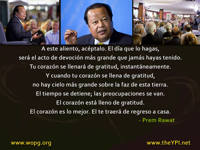 A este aliento, acéptalo. El día que lo hagas, será el acto de devoción más grande que jamás hayas tenido. Tu corazón se llenará de gratitud, instantáneamente. Y cuando tu corazón se llena de gratitud, no hay cielo más grande sobre la faz de esta tierra. El tiempo se detiene; las preocupaciones se van. El corazón está lleno de gratitud. El corazón es lo mejor. El te traerá de regreso a casa.