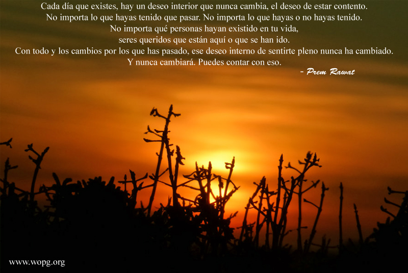 Cada día que existes, hay un deseo interior que nunca cambia, el deseo de estar contento. No importa lo que hayas tenido que pasar. No importa lo que hayas o no hayas tenido. No importa qué personas hayan existido en tu vida, seres queridos que están aquí o que se han ido. Con todo y los cambios por los que has pasado, ese deseo interno de sentirte pleno nunca ha cambiado. Y nunca cambiará. Puedes contar con eso.