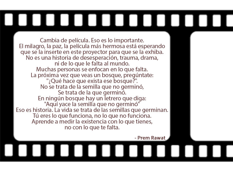 Cambia de película. Eso es lo importante. El milagro, la paz, la película más hermosa está esperando que se la inserte en este proyector para que se la exhiba. No es una historia de desesperación, trauma, drama, ni de lo que le falta al mundo. Muchas personas se enfocan en lo que falta. La próxima vez que veas un bosque, pregúntate: "¿Qué hace que exista ese bosque?". No se trata de la semilla que no germinó, Se trata de la que germinó. En ningún bosque hay un letrero que diga: "Aquí yace la semilla que no germinó" Eso es historia. La vida se trata de las semillas que germinan. Tú eres lo que funciona, no lo que no funciona. Aprende a medir la existencia con lo que tienes, no con lo que te falta.