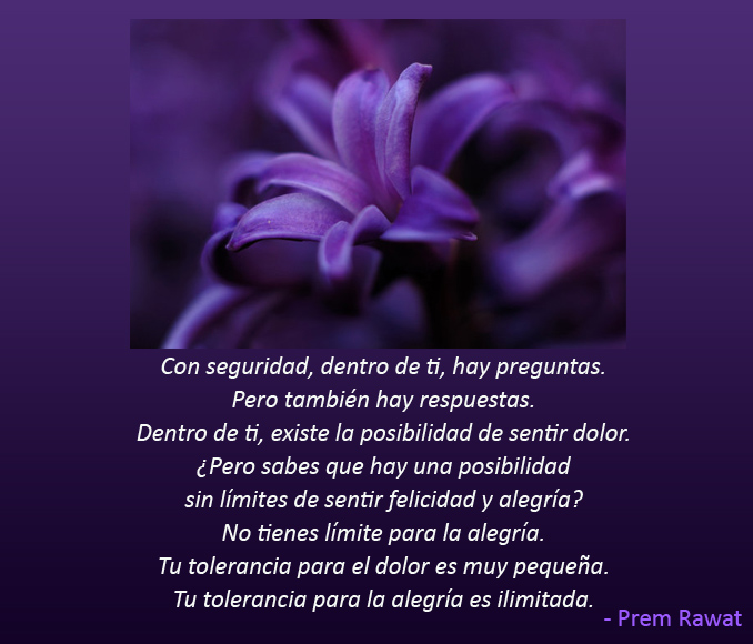 Con seguridad, dentro de ti, hay preguntas. Pero también hay respuestas. Dentro de ti, existe la posibilidad de sentir dolor. ¿Pero sabes que hay una posibilidad sin límites de sentir felicidad y alegría? No tienes límite para la alegría. Tu tolerancia para el dolor es muy pequeña. Tu tolerancia para la alegría es ilimitada.