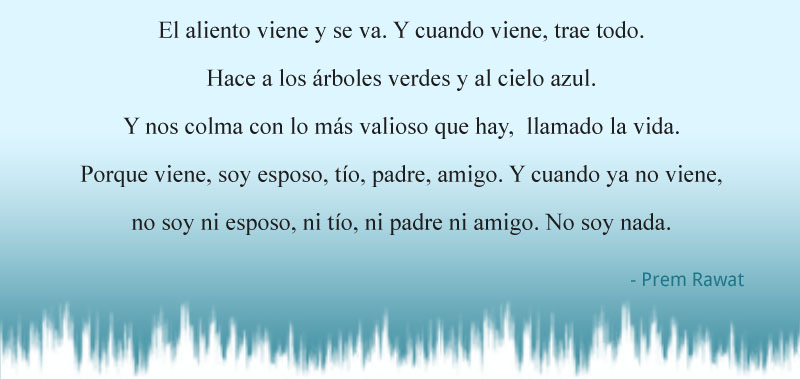 El aliento viene y se va. Y cuando viene, trae todo. Hace a los árboles verdes y al cielo azul. Y nos colma con lo más valioso que hay, llamado la vida. Porque viene, soy esposo, tío, padre, amigo. Y cuando ya no viene, No soy ni esposo, ni tío, ni padre ni amigo. No soy nada.