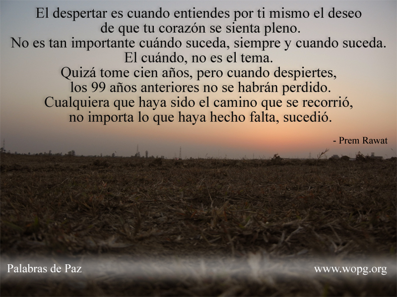 El despertar es cuando entiendes por ti mismo el deseo de que tu corazón se sienta pleno. No es tan importante cuándo suceda, siempre y cuando suceda. El cuándo, no es el tema. Quizá tome cien años, pero cuando despiertes, los 99 años anteriores no se habrán perdido. Cualquiera que haya sido el camino que se recorrió, no importa lo que haya hecho falta, sucedió.