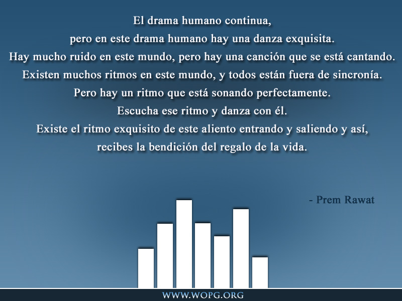 El drama humano continua, pero en este drama humano hay una danza exquisita. Hay mucho ruido en este mundo, pero hay una canción que se está cantado. Existen muchos ritmos en este mundo, y todos están fuera de sincronía. Pero hay un ritmo que está sonando perfectamente. Escucha ese ritmo y danza con él. Existe el ritmo exquisito de este aliento entrando y saliendo y así, recibes la bendición del regalo de la vida.