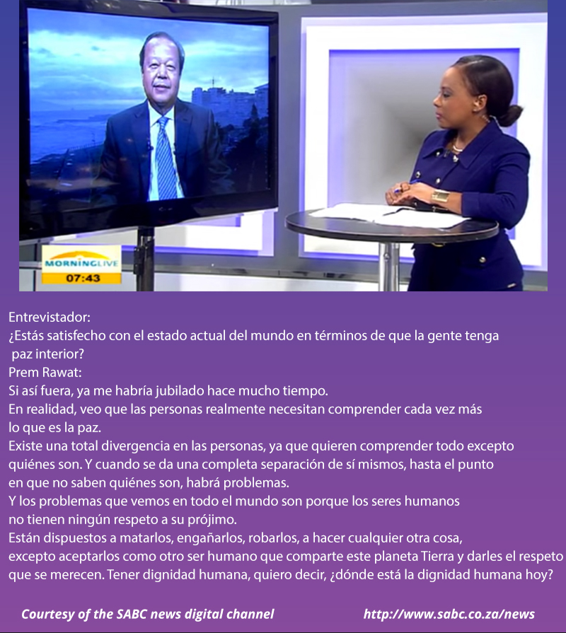 Prem Rawat: Si así fuera, ya me habría jubilado hace mucho tiempo. En realidad, veo que las personas realmente necesitan comprender cada vez más lo que es la paz. Existe una total divergencia en las personas, ya que quieren comprender todo excepto quiénes son. Y cuando se da una completa separación de sí mismos, hasta el punto en que no saben quiénes son, habrá problemas. Y los problemas que vemos en todo el mundo son porque los seres humanos no tienen ningún respeto a su prójimo. Están dispuestos a matarlos, engañarlos, robarlos, a hacer cualquier otra cosa, excepto aceptarlos como otro ser humano que comparte este planeta Tierra y darles el respeto que se merecen. Tener dignidad humana, quiero decir, ¿dónde está la dignidad humana hoy?