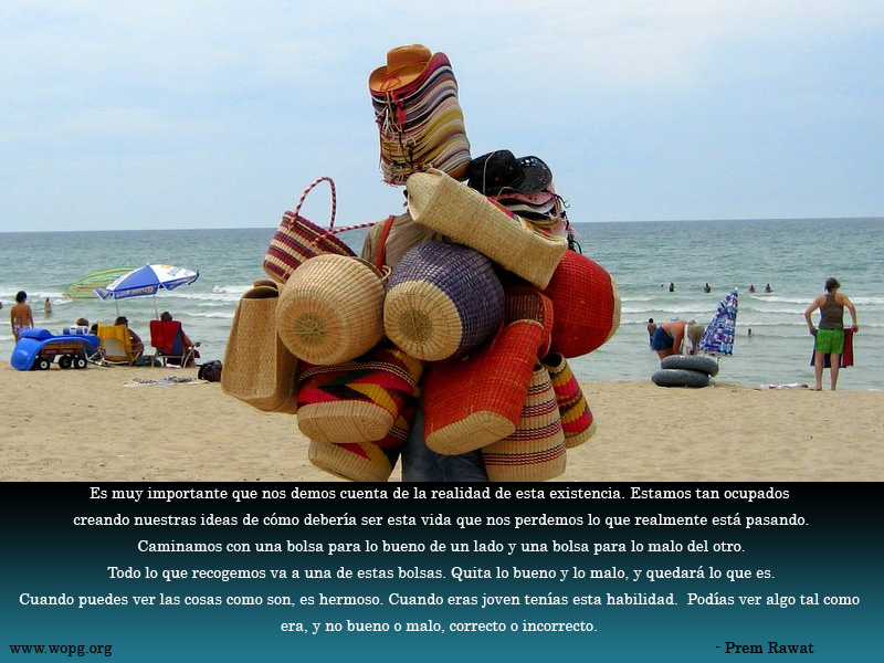 Es muy importante que nos demos cuenta de la realidad de esta existencia. Estamos tan ocupados creando nuestras ideas de cómo debería ser esta vida que nos perdemos lo que realmente está pasando. Caminamos con una bolsa para lo bueno de un lado y una bolsa para lo malo del otro. Todo lo que recogemos va a una de estas bolsas. Quita lo bueno y lo malo, y quedará lo que es. Cuando puedes ver las cosas como son, es hermoso. Cuando eras joven tenías esta habilidad. Podías ver algo tal como era, y no bueno o malo, correcto o incorrecto.
