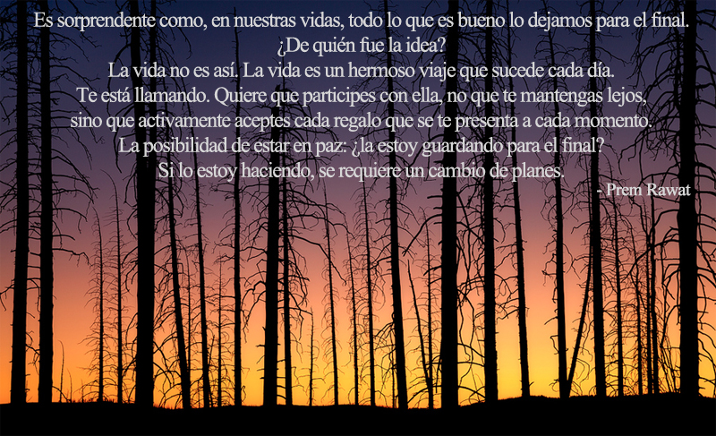 Es sorprendente como, en nuestras vidas, todo lo que es bueno lo dejamos para el final. ¿De quién fue la idea? La vida no es así. La vida es un hermoso viaje que sucede cada día. Te está llamando. Quiere que participes con ella, no lejos de ella, sino que activamente aceptes cada regalo que se te presenta a cada momento. La posibilidad de estar en paz: ¿la estoy guardando para el final? Si lo estoy haciendo, se requiere un cambio de planes. Necesito tener la experiencia de paz cada día que estoy vivo.