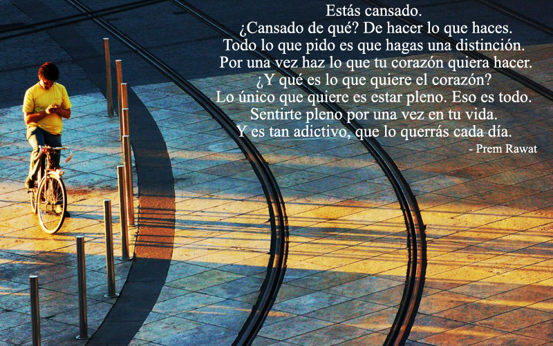Estás cansado. ¿Cansado de qué? De hacer lo que haces. Todo lo que pido es que hagas una distinción. Por una vez haz lo que tu corazón quiera hacer. ¿Y qué es lo que quiere el corazón? Lo único que quiere es estar pleno. Eso es todo. Sentirte pleno por una vez en tu vida. Y es tan adictivo, que lo querrás cada día.
