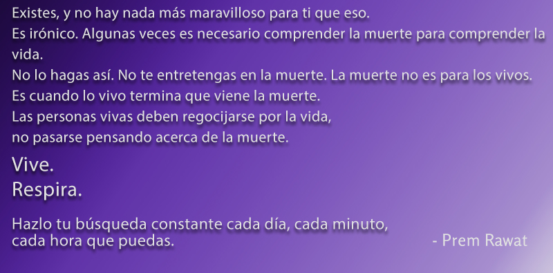 Existes, y no hay nada más maravilloso para ti que eso. Es irónico. Algunas veces es necesario comprender la muerte para comprender la vida. No lo hagas así. No te entretengas en la muerte. La muerte no es para los vivos. Es cuando lo vivo termina que viene la muerte. Las personas vivas deben regocijarse por la vida, no pasarse pensando acerca de la muerte. Vive. Respira. Hazlo tu búsqueda constante cada día, cada minuto, cada hora que puedas.