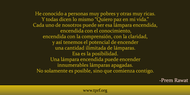 He conocido a personas muy pobres y otras muy ricas. Y todas dicen lo mismo “Quiero paz en mi vida.” Cada uno de nosotros puede ser esa lámpara encendida, encendida con el conocimiento, encendida con la comprensión, con la claridad, y así tenemos el potencial de encender una cantidad ilimitada de lámparas. Esa es la posibilidad. Una lámpara encendida puede encender innumerables lámparas apagadas. No solamente es posible, sino que comienza contigo.