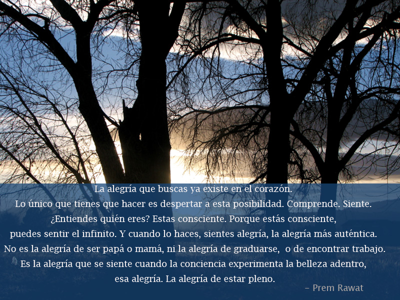 La alegría que buscas ya existe en el corazón. Lo único que tienes que hacer es despertar a esta posibilidad. Comprende. Siente. ¿Entiendes quién eres? Estás consciente. Porque estás consciente, puedes sentir el infinito. Y cuando lo haces, sientes alegría, la alegría más auténtica. No es la alegría de ser papá o mamá, ni la alegría de graduarse, o de encontrar trabajo. Es la alegría que se siente cuando la conciencia experimenta la belleza adentro, esa alegría. La alegría de estar pleno.