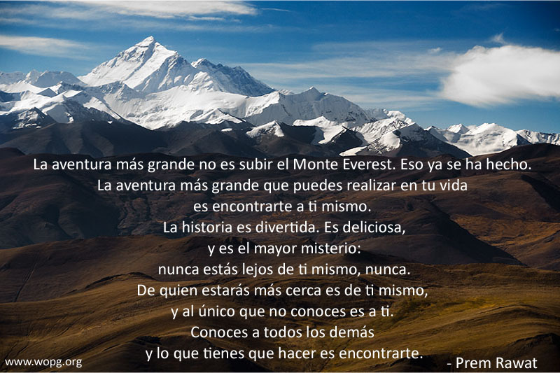 La aventura más grande no es subir el Monte Everest. Eso ya se ha hecho. La aventura más grande que puedes realizar en tu vida es encontrarte a ti mismo. La historia es divertida. Es deliciosa, Y es el mayor misterio: Nunca estás lejos de ti mismo, nunca. De quien estarás más cerca es de ti mismo, Y al único que no conoces es a ti. Conoces a todos los demás y lo que tienes que hacer es encontrarte.