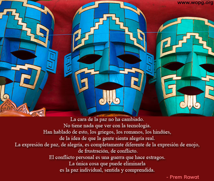 La cara de la paz no ha cambiado. No tiene nada que ver con la tecnología. Han hablado de esto, los griegos, los romanos, los hindúes, de la idea de que la gente sienta alegría real. La expresión de paz, de alegría, es completamente diferente de la expresión de enojo, frustración, de conflicto. El conflicto personal es una guerra que hace estragos. La única cosa que puede eliminarla es la paz individual, sentida y comprendida.