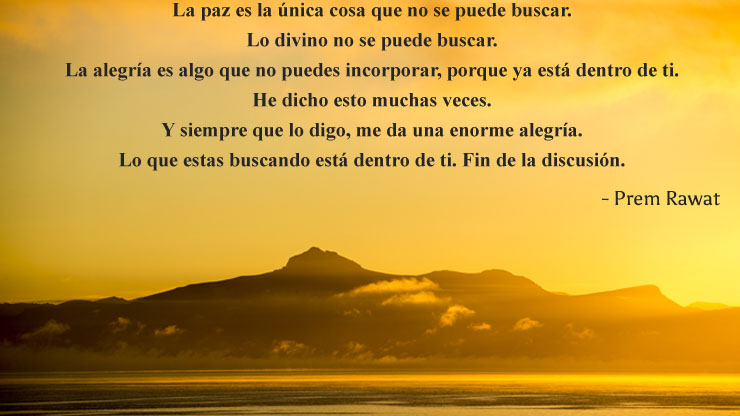 La paz es la única cosa que no se puede buscar. Lo divino no se puede buscar. La alegría es algo que no puedes incorporar, porque ya está dentro de ti. He dicho esto muchas veces. Y siempre que lo digo, me da una enorme alegría. Lo que estas buscando está dentro de ti. Fin de la discusión.