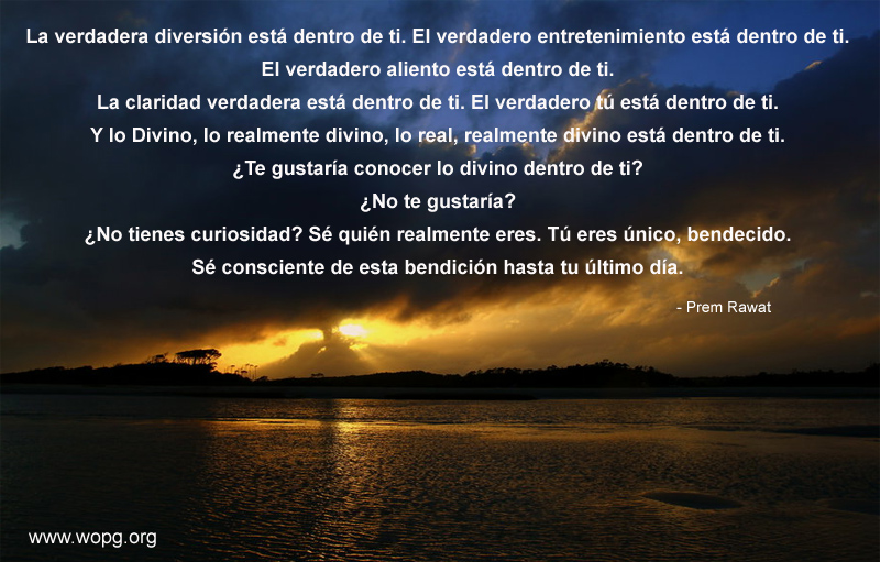 La verdadera diversión está dentro de ti. El verdadero entretenimiento está dentro de ti. El verdadero aliento está dentro de ti. La claridad verdadera está dentro de ti. El verdadero tú está dentro de ti. Y lo Divino, lo realmente divino, lo real, realmente divino está dentro de ti. ¿Te gustaría conocer lo divino dentro de ti? ¿No te gustaría? ¿No tienes curiosidad? Sé quién realmente eres. Tú eres único, bendecido. Sé consciente de esta bendición hasta tu último día.