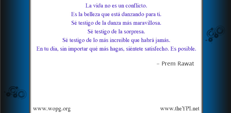 La vida no es un conflicto. Es la belleza que está danzando para ti. Sé testigo de la danza más maravillosa. Sé testigo de la sorpresa. Sé testigo de lo más increíble que habrá jamás. En tu día, sin importar qué más hagas, siéntete satisfecho. Es posible.