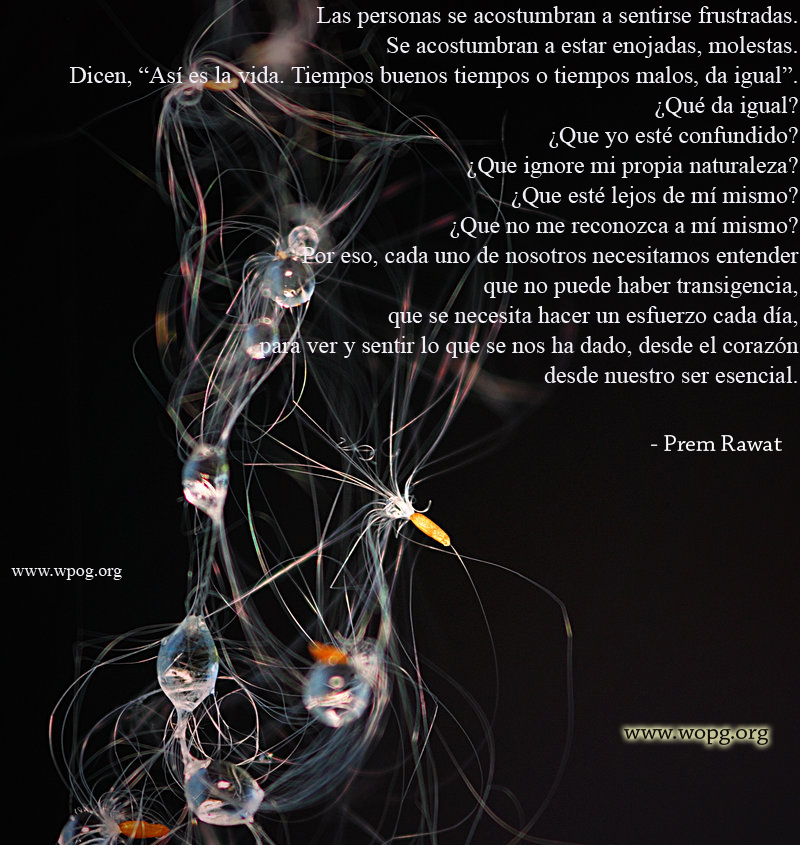 Las personas se acostumbran a sentirse frustradas. Se acostumbran a estar enojadas, molestas. Dicen, “Así es la vida. Tiempos buenos tiempos o tiempos malos, da igual”. ¿Qué da igual? ¿Que yo esté confundido? ¿Que ignore mi propia naturaleza? ¿Que esté lejos de mí mismo? ¿Que no me reconozca a mí mismo? Por eso, cada uno de nosotros necesitamos entender que no puede haber transigencia, que se necesita hacer un esfuerzo cada día, para ver y sentir lo que se nos ha dado, desde el corazón desde nuestro ser esencial.